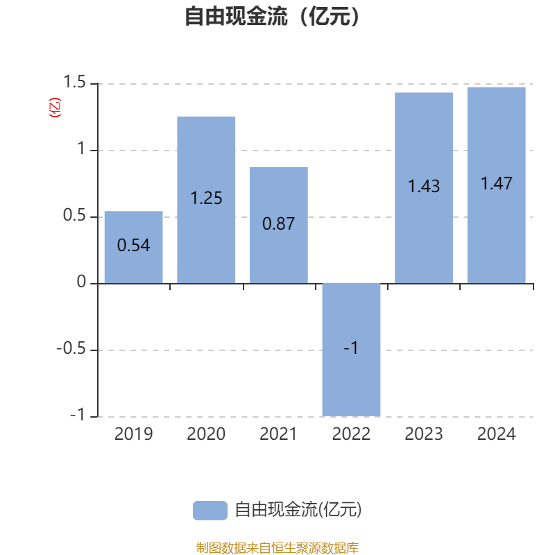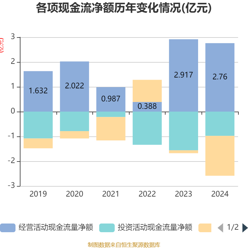 截至2024年,公司经营活动现金流净额为2.76亿元,同比下降5.39%;筹资活动现金流净额-1.61亿元,同比减少1.49亿元;投资活动现金流净额-9783.16万元,上年同期为-1.56亿元。