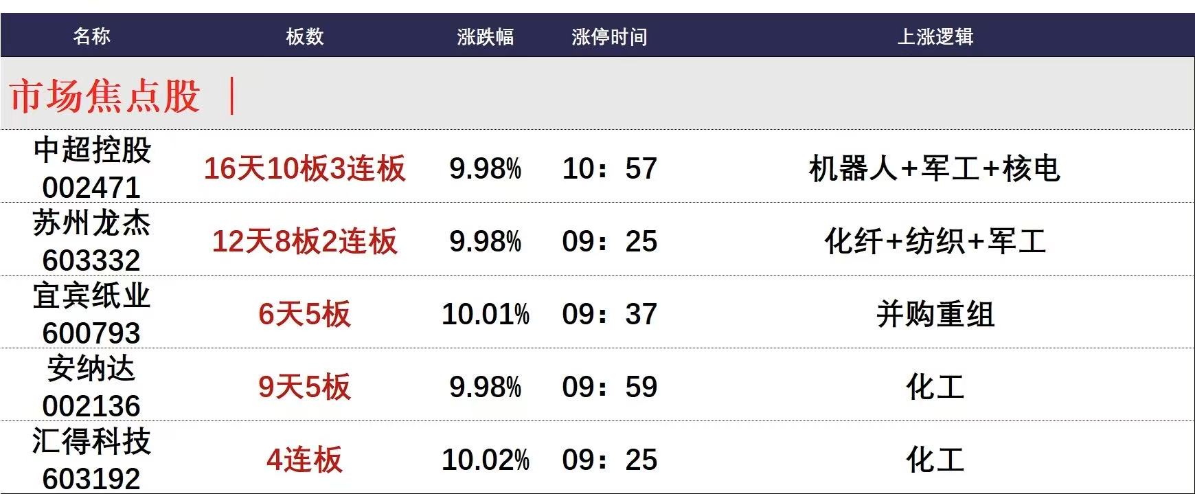 今日午盘全市场共43股涨停,连板股总数8只,18股封板未遂,封板率为70%(不含ST股、退市股)。焦点股方面,可控核聚变概念再度领涨,中超控股16天10板,哈焊华通20CM2连板;部分化工股反复活跃东南配资,苏州龙杰12天8板,安纳达9天5板,汇得科技4连板。