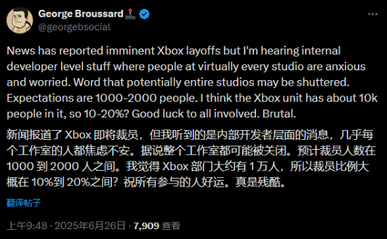 如果将Activision和Bethesda算作Xbox团队的一部分(这在目前看来很可能属实),那么这相当于裁掉了约10%的员工。更令人担忧的是,传言称这次裁员甚至可能伴随着工作室的关闭。鉴于Activision和Bethesda在之前的几轮裁员中也未能幸免金诚无忧,这次恐怕也难以置身事外。