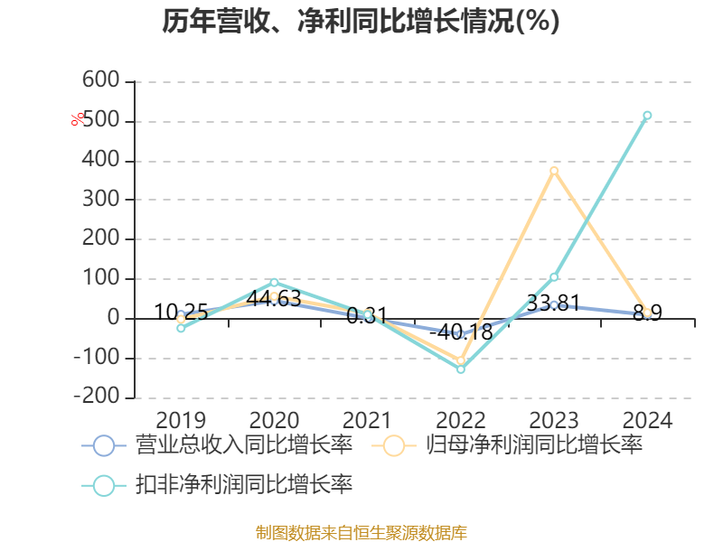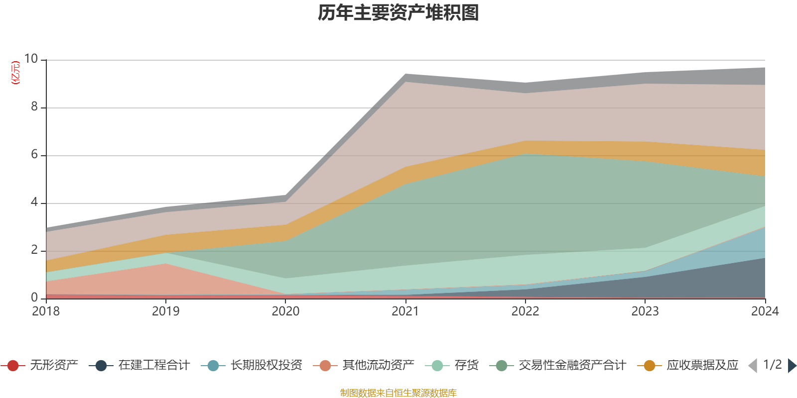 资产重大变化方面,截至2024年末,公司交易性金融资产合计较上年末减少65.56%,占公司总资产比重下降25.37个百分点;长期股权投资较上年末增加427.14%,占公司总资产比重上升10.71个百分点;在建工程合计较上年末增加92.34%,占公司总资产比重上升8.07个百分点;应收票据及应收账款较上年末增加33.84%,占公司总资产比重上升2.72个百分点。