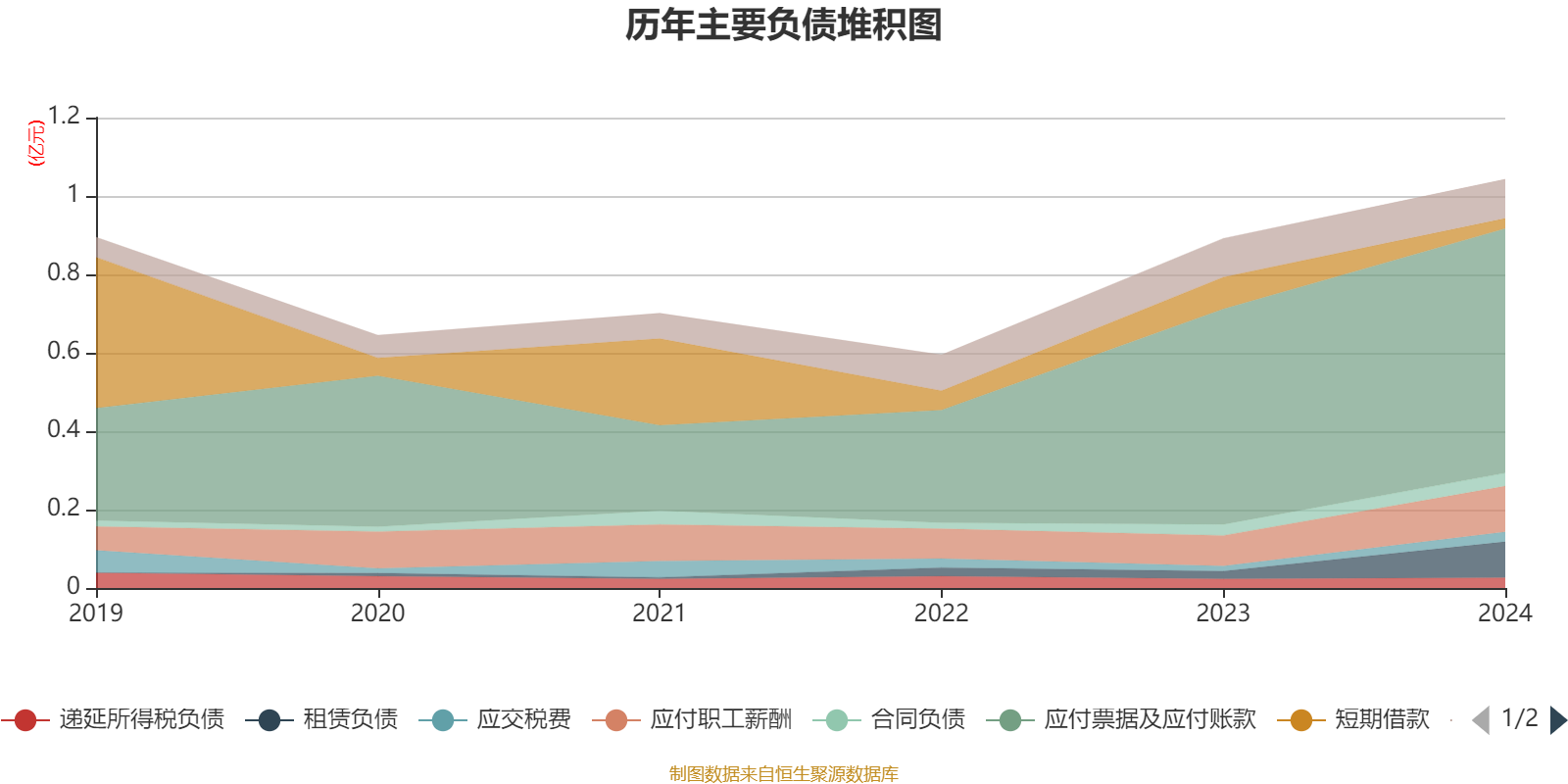 负债重大变化方面,截至2024年末,公司租赁负债较上年末增加360.92%,占公司总资产比重上升0.74个百分点;应付票据及应付账款较上年末增加13.46%,占公司总资产比重上升0.65个百分点;短期借款较上年末减少68.15%,占公司总资产比重下降0.59个百分点;应付职工薪酬较上年末增加49.62%,占公司总资产比重上升0.38个百分点。