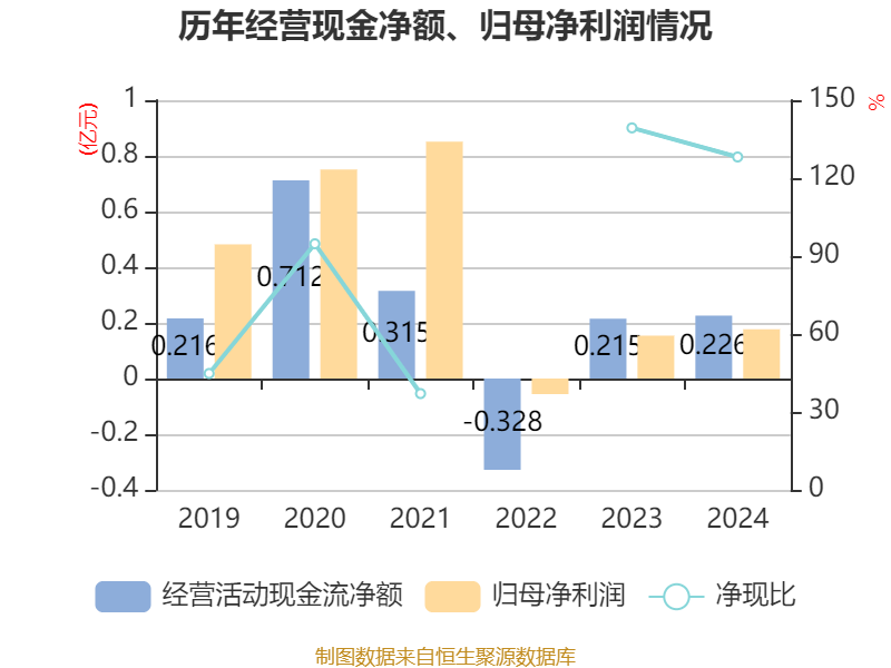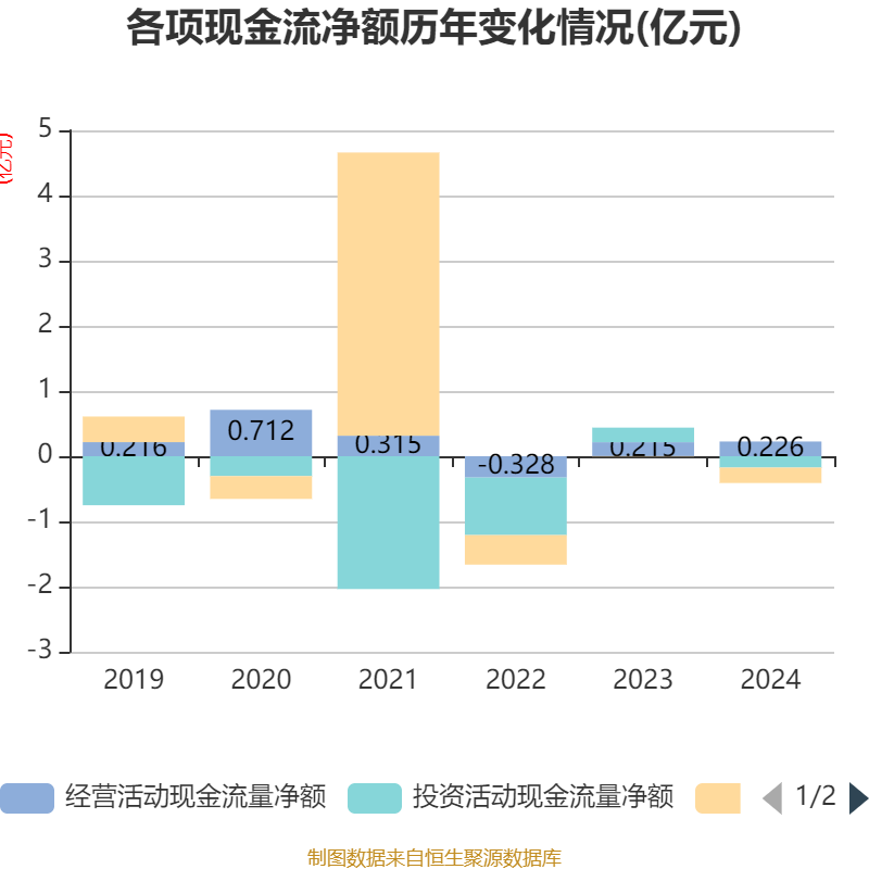 截至2024年,公司经营活动现金流净额为2261.97万元,同比增长5.32%;筹资活动现金流净额-2368.31万元,同比减少2308.19万元;投资活动现金流净额-1740.17万元,上年同期为2241.79万元。