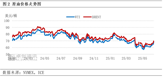 其次从成本端来看,2025年上半年,能源价格整体偏弱,宏观风险加剧、供需格局演变驱动能源商品价格承压运行。虽然一季度前期在1月份拜登政府任期结束之际,美国加码对欧洲某国能源制裁,制裁力度超出市场预期,引发油市对供应端紧张情绪升温,WTI一度走高。但随着特朗普政府上任,相关政策打压油价,原油价格出现明显回落。而二季度由于4月特朗普全面“对等关税”落地,叠加 OPEC+计划增产,供应端施压,带动原油价格下行幅度加剧。虽然自5月起,宏观市场情绪缓和,关税风险有所降温,叠加短期宏观、地缘利好因素推涨,油价有所反弹,随后6月中旬因为伊以地缘局势急速升温,风险溢价拉升,WTI站上70美元/桶。但2025年上半年原油价格波动重心多维持低位震荡,因此,整体来看,上半年成本端对沥青现货价格支撑不足。