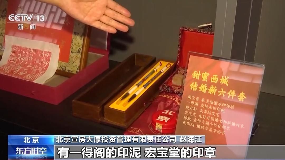北京宣房大厚投资管理有限责任公司 赵海江:有一得阁的印泥、宏宝堂的印章、戴月轩的结发笔、宏宝堂的婚书等,结合成“甜蜜六件套”。
