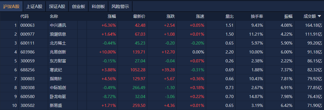 个股方面,中兴通讯成交额超164亿元居首,浪潮信息、北方稀土、兆易创新成交额靠前。