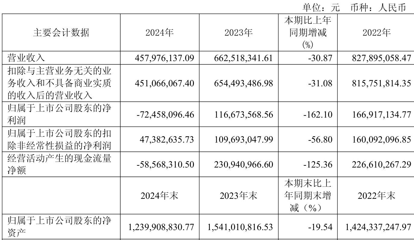 中证智能财讯集友股份(603429)4月26日披露2024年年度报告。2024年,公司实现营业总收入4.58亿元,同比下降30.87%;归母净利润亏损7245.81万元,上年同期盈利1.17亿元;扣非净利润4738.26万元,同比下降56.80%;经营活动产生的现金流量净额为-5856.83万元,上年同期为2.31亿元;报告期内,集友股份基本每股收益为-0.14元,加权平均净资产收益率为-5.26%。