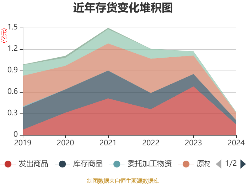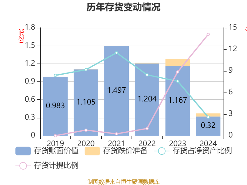从存货变动来看,截至2024年末,公司存货账面价值为3195.25万元,占净资产的2.58%,较上年末减少8477.35万元。其中,存货跌价准备为523.81万元,计提比例为14.08%。