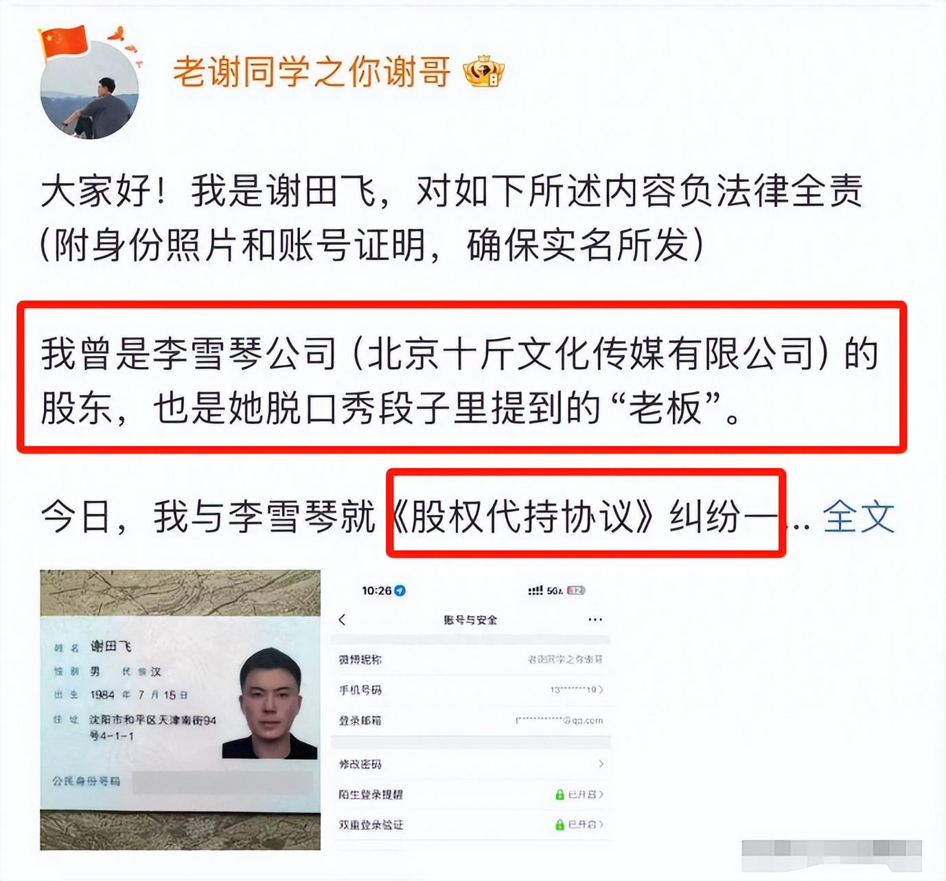老谢说的就是这么个情况,他和李雪琴合伙开的“北京十斤文化”,李雪琴(原名李雪阳)是大股东,占90%,他是那个“隐名股东”。